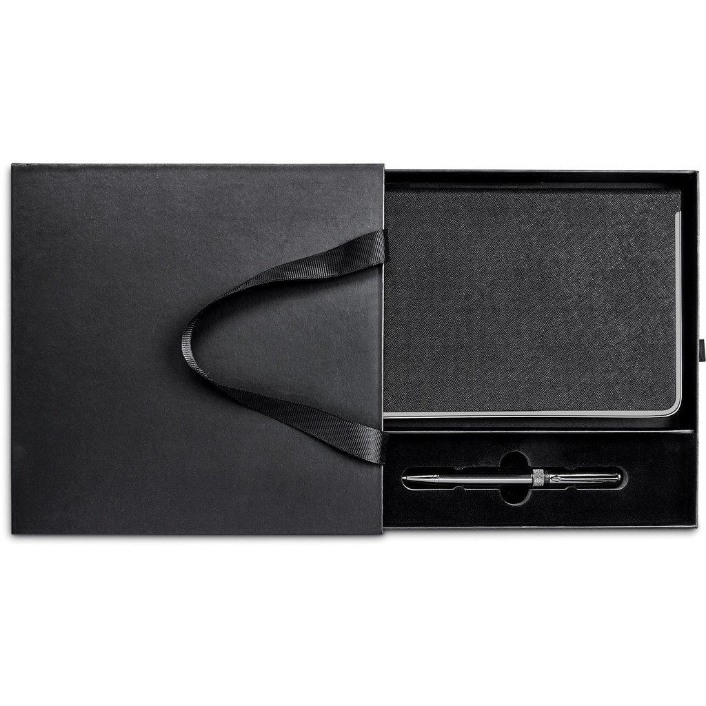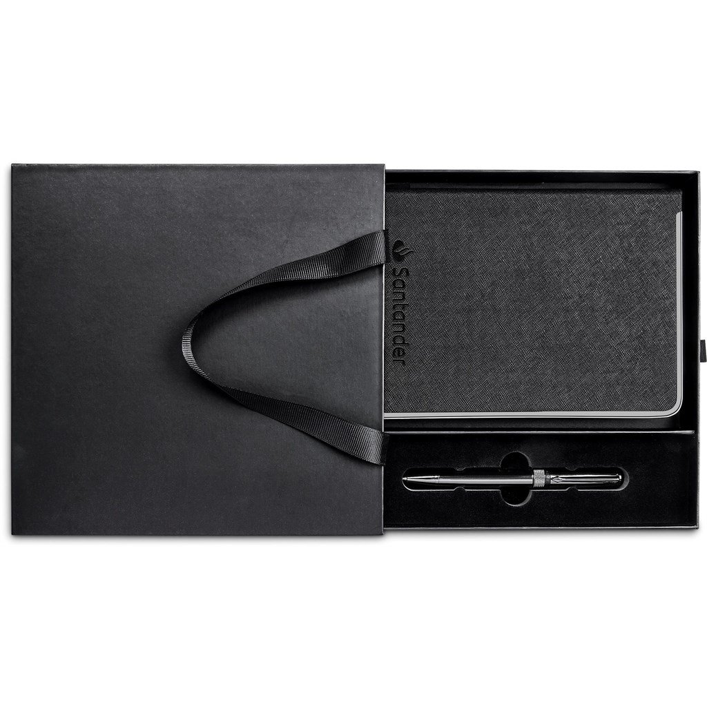 The notebook in this Alex Varga gift set has a metal frame edging which matches the striking gun metal finish of the ball pen it’s paired with.