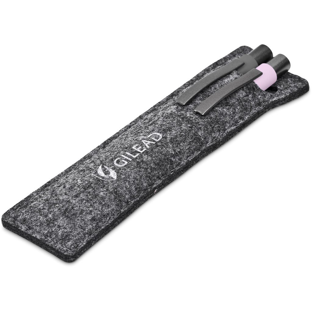 A light grey metal pencil and a metal pen in a choice of contemporary, fashionable colours are paired together in a grey pouch made from RPET felt. Laser engraving on the rubberised finish barrel of the pen and the pencil provides a clean precise effect which is both subtle and visible. The ball pen refill contains good quality, black German ink and will provide smooth, uninterrupted writing for a minimum of 1,500 metres. The pencil is fitted with break-resistant 0.5mm lead. A set with a different colour pen and pencil makes it easier to instantly identify which is the pen and which is the pencil. If you’re looking for something a little different from your standard corporate and promotional colours, then consider this attractive pen & pencil set, which is offered in contemporary, fashionable colours.