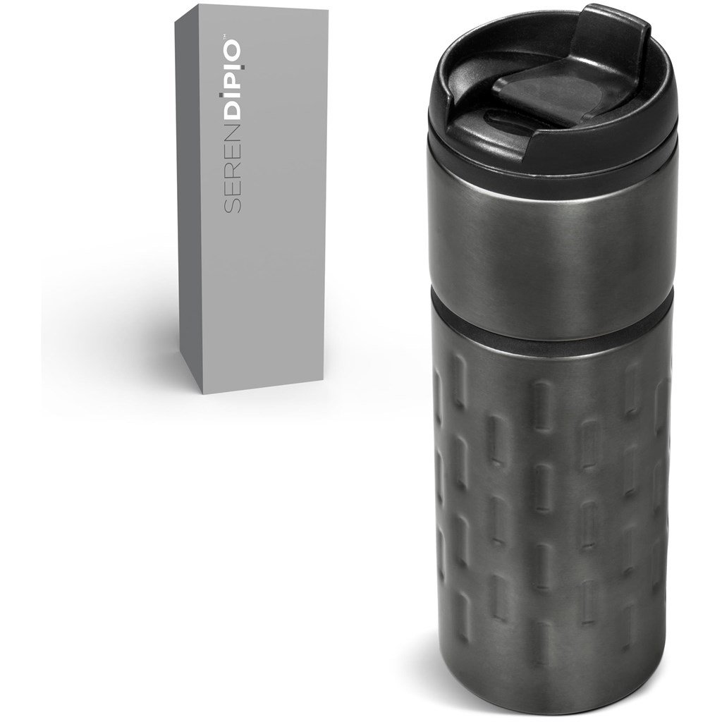 The industrial-style design of this tumbler makes it an attractive option for the right design or message. It features a stainless steel outer with a pp inner, so it will keep your drink hotter or colder for longer.