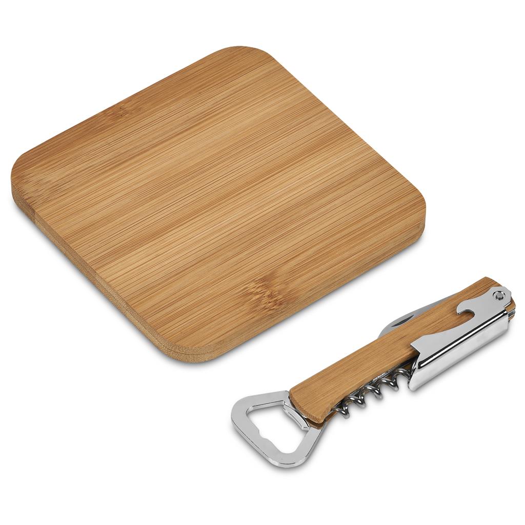 - large front pocket with bamboo cheese board and tool with corkscrew, bottle opener and cheese knife
